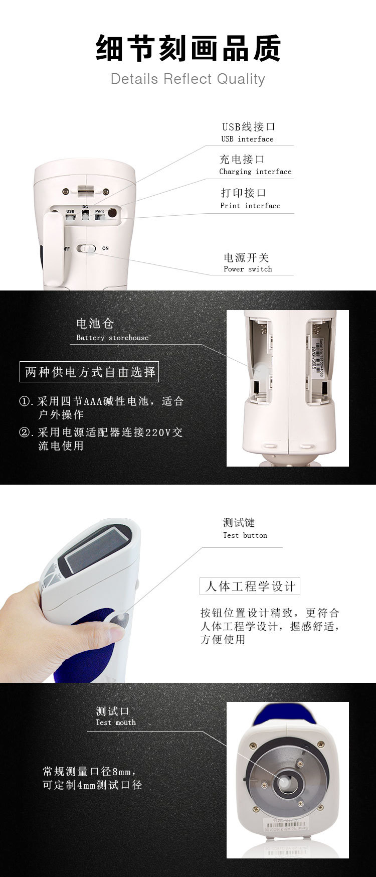 儀器內置日本的傳感器,美G的信息處理芯片;保證了光信號的準確傳輸和電信號的穩定,為儀器的精度和重復性保駕護航,顯示精度0.01,重復精度△E標準偏差值0.08。