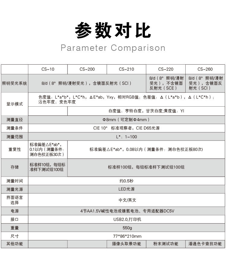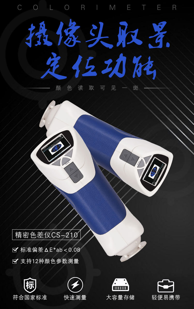CS-210精密色差儀,廣泛應用于塑膠、印刷、油漆油墨、紡織、印染服裝等行業的顏色管理*域,根據CIE色空間測量樣品色值L*a*b、L*c*h,與被測樣品的色差△E以及 △Lab值。