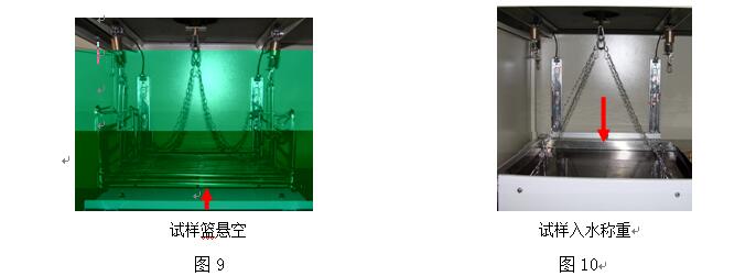 2、將網籃掛上電子天平的底掛鉤,關閉循環開關,待電子天平讀數穩定后按電子天平的“去皮”鍵,天平顯示為“0.0”,把試件放入網籃中浸水(3~5)min,讀取水中質量(mw)。
